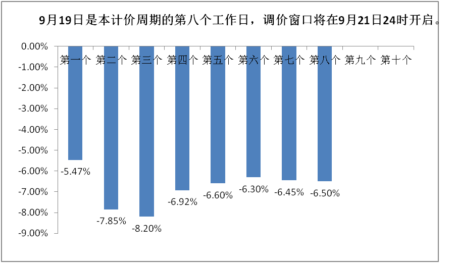 成品油:中国汽、柴油批发价格显示,9月16日中国汽、柴油批发价格下跌。全国92#汽油平均批发价格为9384元/吨,较前一日下跌57元/吨;柴油(含低凝点)平均批发价格为9036元/吨,较前一日下跌9元/吨。当日市场整体情况来看,国际油价15日显著下跌,一揽子原油平均价格变化率维持负向运行,9月21日24时国内成品油零售价格存下调预期,消息面指向利空,汽、柴油批发价格承压下行。