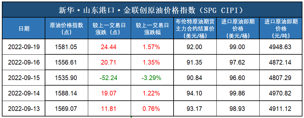 新华财经北京9月20日电(杨猛) 截至2022年9月19日,新华·山东港口·金联创原油价格指数(SPG CIPI)报1581.05点,较前一交易日上涨24.44点,涨幅1.57%;进口原油即期价格为99.00美元/桶,合人民币4948.63元/吨。山东港口进口原油综合到岸贴水估价为3.22美元/桶,较前一交易日上涨0.03美元/桶,涨幅0.94%。