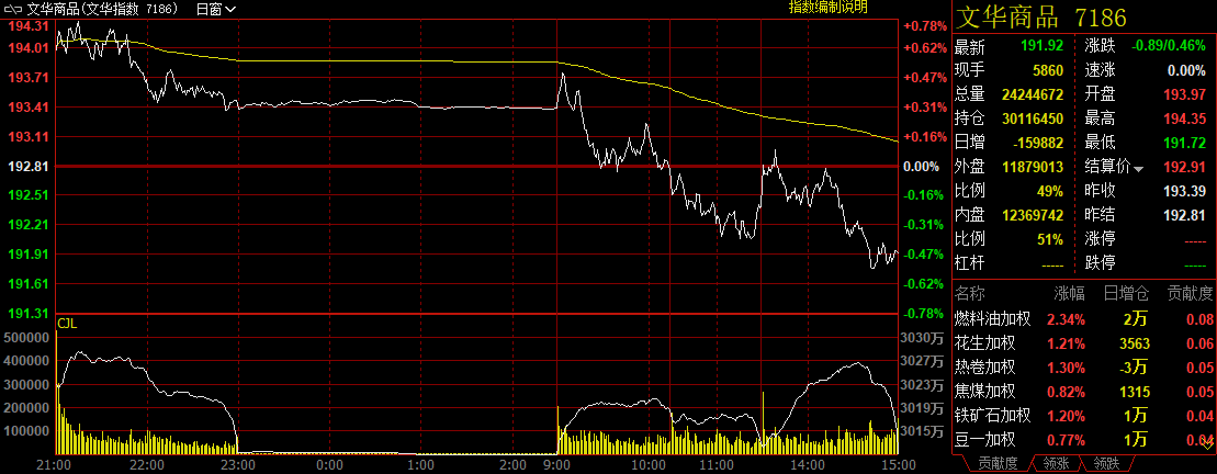 新华财经北京9月23日电(张瑶、郭洲洋)国内商品期货市场周五(9月23日)收盘跌多涨少。截至下午收盘,追踪国内商品市场的综合指数收报191.92点,较上一交易日下跌0.89点,跌幅0.46%。下跌品种中,液化石油气(LPG)、甲醇、纸浆、苹果、棉花主力合约跌超2%;棉纱、沪镍、棕榈油、不锈钢(SS)、硅铁、短纤、豆油、红枣、淀粉主力合约跌超1%。上涨品种中,燃料油主力合约涨超2%;沪银、热卷、铁矿石、螺纹钢、纯碱、花生主力合约涨超1%。