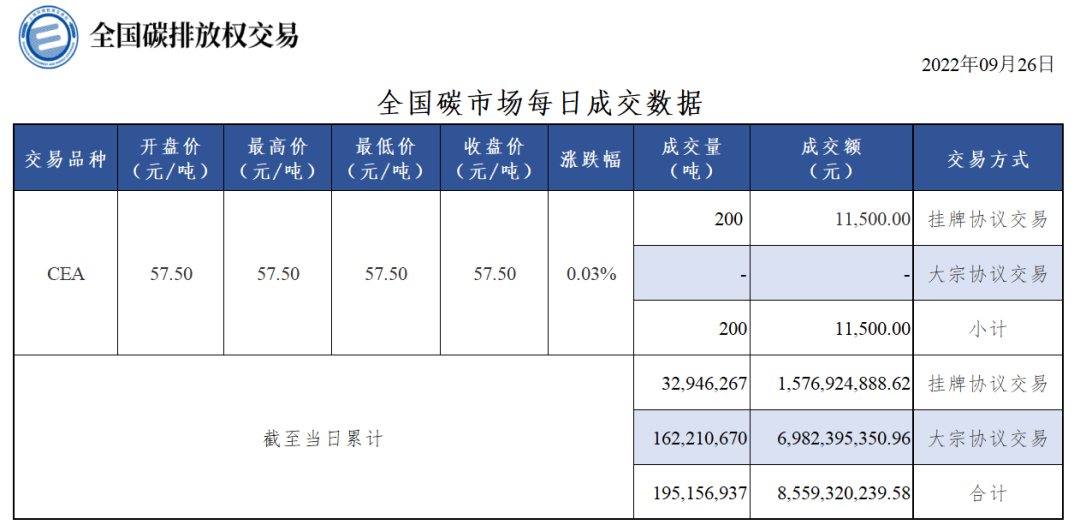 9月26日全国碳市场碳排放配额(CEA)挂牌协议交易成交量200吨,成交额11,500.00元,收盘价57.50元/吨,收盘价较前一日上涨0.03%。今日无大宗协议交易。