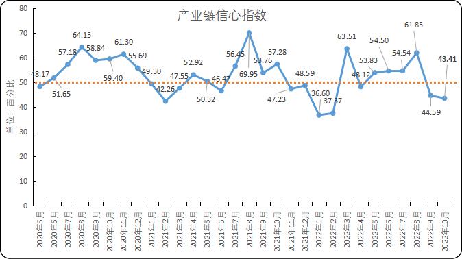 10月份产业链信心指数为43.41%,较上月下跌1.18个百分点,低于50%临界点,产业内从业者信心指数依旧维持低位运行态势。最主要原因是供应压力偏大,但终端需求释放缓慢,商家对市场持谨慎态度。其中新订单指数下滑5.83个百分点至39.12%,生产指数下滑至40%。