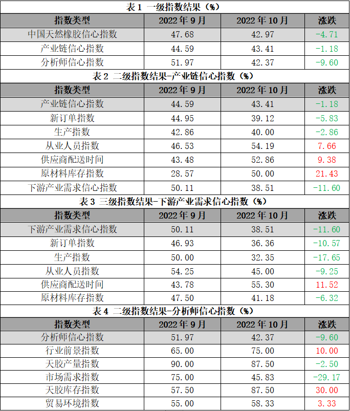 表1 2022年9月-2022年10月中国天然橡胶市场信心指数(NRMCI)运行情况