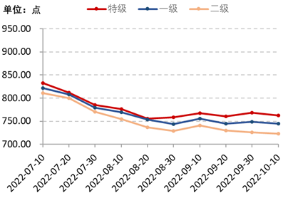 从质量等级维度来看,十月上旬各等级花椒价格微幅下滑,各等级花椒价格差距保持稳定。截至10月10日,特级花椒价格指数报762.81点,较上期下跌0.67%,较基期下跌23.72%;一级花椒价格指数报744.54点,较上期下跌0.51%,较基期下跌25.55%;二级花椒价格指数报722.67点,较上期下跌0.42%,较基期下跌27.73%。