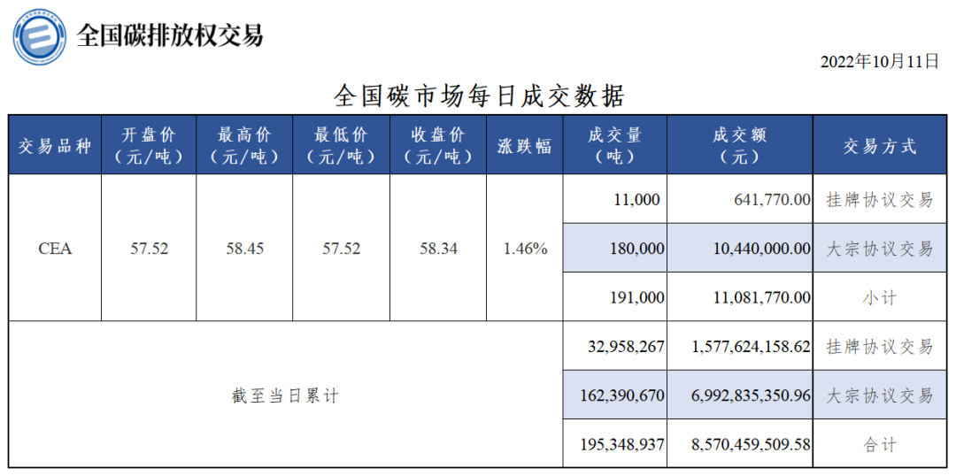 10月11日全国碳市场收盘价58.34元/吨 较前一日上涨1.46%