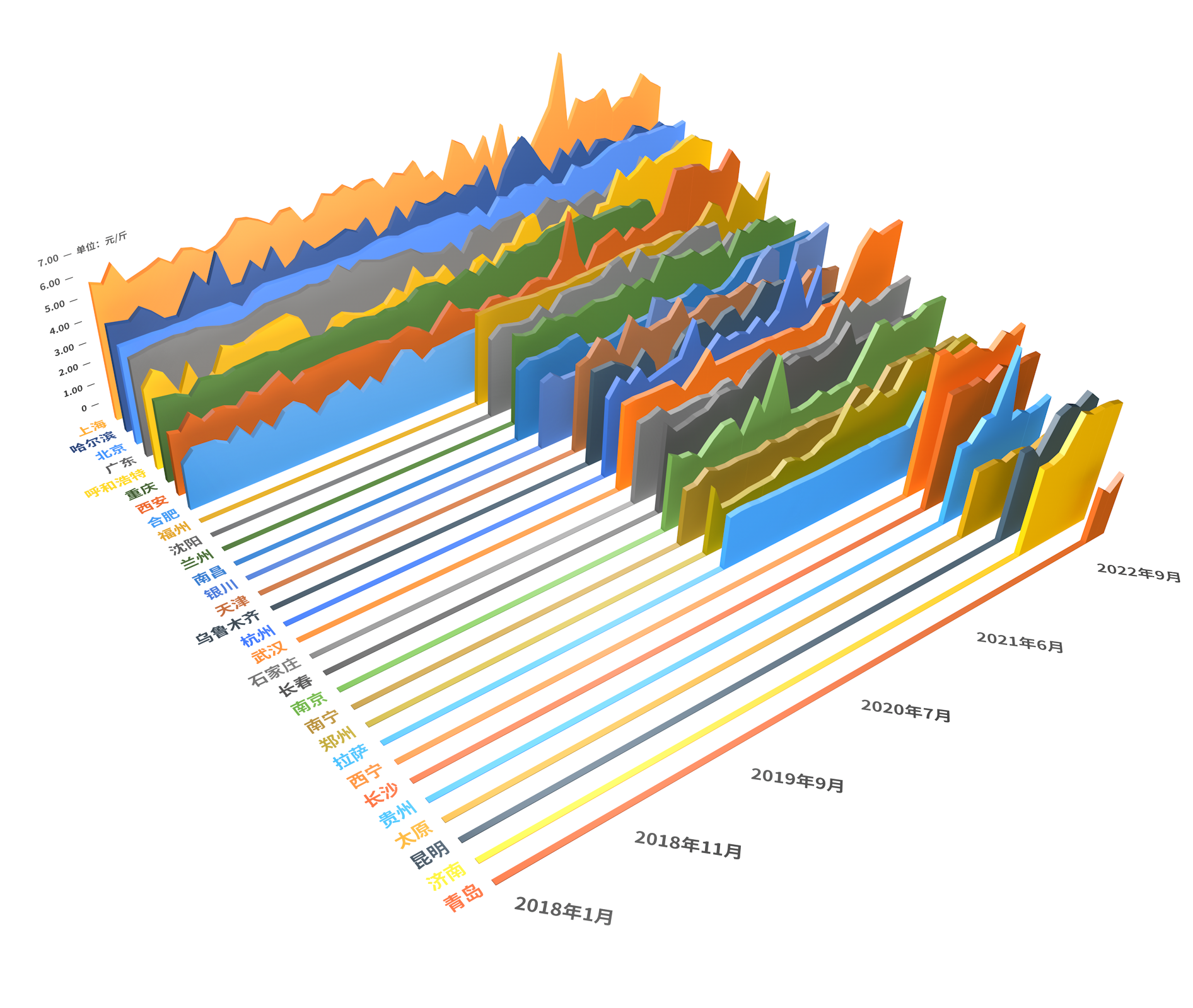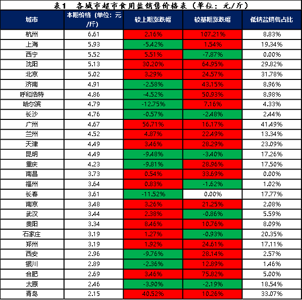 分城市来看,2022年9月,杭州、西宁、沈阳、北京、广州、兰州、天津、南昌、福州、南京、武汉、贵阳、石家庄、郑州、合肥、青岛超市销售食用盐均价较2022年8月上涨;上海、济南、呼和浩特、哈尔滨、长沙、昆明、重庆、长春、西安、银川、太原超市销售食用盐均价较2022年8月下跌。