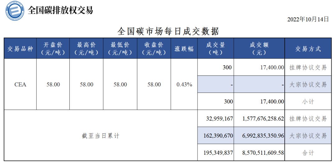 10月14日全国碳市场碳排放配额(CEA)挂牌协议交易成交量300吨,成交额17,400.00元,收盘价58.00元/吨,收盘价较前一日上涨0.43%。今日无大宗协议交易。