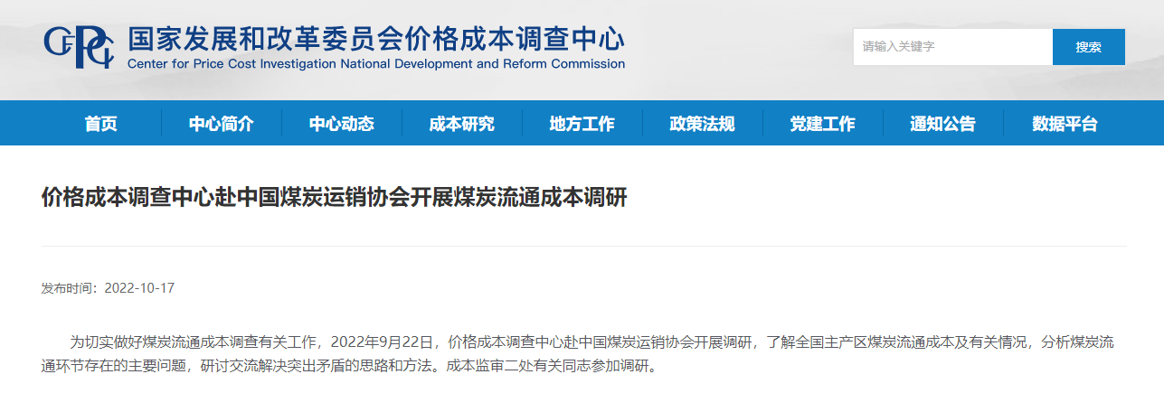 新华财经北京10月17日电 据国家发展改革委价格成本调查中心网站17日消息,为切实做好煤炭流通成本调查有关工作,日前,价格成本调查中心赴中国煤炭运销协会开展调研,了解全国主产区煤炭流通成本及有关情况,分析煤炭流通环节存在的主要问题,研讨交流解决突出矛盾的思路和方法。成本监审二处有关同志参加调研。