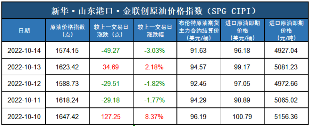 新华财经北京10月17日电(杨猛) 截至2022年10月14日,新华·山东港口·金联创原油价格指数(SPG CIPI)报1574.15点,较前一交易日下跌49.27点,跌幅3.03%;进口原油即期价格为96.18美元/桶,合人民币4927.04元/吨。山东港口进口原油综合到岸贴水估价为4.51美元/桶,较前一交易日持平。