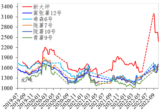 除本土消费为主的新大坪和销售受限的陇薯7号外,其余品类均出现小幅上涨,尤其相对低价的冀张薯12号领涨。具体来看,当期冀张薯12号产地批发价格为1717.14元/吨,环比上涨5.09%;希森6号为1718.15元/吨,环比上涨1.84%;陇薯7号则下跌至1653.75元/吨,环比下跌3.13%。同期,青薯9号为1562.00元/吨,环比上涨1.33%;陇薯10号则为1631.67元/吨,涨幅仅0.82%。此外,新大坪大幅回调至2380.00元/吨,环比下跌10.19%。鉴于短期内供应偏紧态势难以转变,定西商品薯产地批发价格或将持续偏强运行。