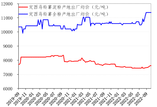 生产原料价格持续提升,带动了国内薯制品生产集聚。目前,国内初级薯制品生产开工率不足,定西乃至全国初级薯制品出厂价格持续看涨。截至10月14日,定西马铃薯淀粉出厂价格报7617.39元/吨,环比持平,同比下跌1.13%;定西马铃薯全粉出厂价格报11370.00元/吨,环比持平,同比上涨7.40%。