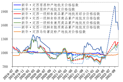 备注:样本发生变化时进行指数修正,通常为年度内调整。对应地,产地均价不作修正以便反映确切产地价格水平。截至2022年10月14日,2022/2023年度新华·定西原原种产地批发价格指数和新华·定西原种产地批发价格指数亦开始试运行,预计月内正式运维。