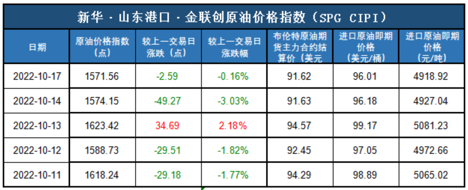 新华财经北京10月18日电(杨猛) 截至2022年10月17日,新华·山东港口·金联创原油价格指数(SPG CIPI)报1571.56点,较前一交易日下跌2.59点,跌幅0.16%;进口原油即期价格为96.01美元/桶,合人民币4918.92元/吨。山东港口进口原油综合到岸贴水估价为4.77美元/桶,较前一交易日上涨0.26美元/桶,涨幅5.76%。