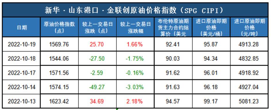新华财经北京10月20日电(杨猛) 截至2022年10月19日,新华·山东港口·金联创原油价格指数(SPG CIPI)报1569.76点,较前一交易日上涨25.70点,涨幅1.66%;进口原油即期价格为95.87美元/桶,合人民币4913.28元/吨。山东港口进口原油综合到岸贴水估价为4.69美元/桶,较前一交易日上涨0.05美元/桶,涨幅1.08%。