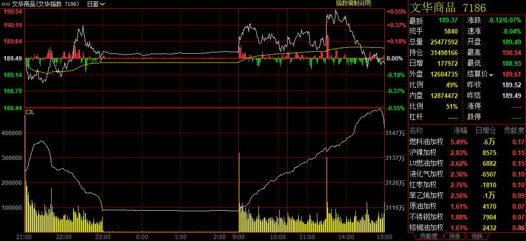 截至20日下午收盘时,追踪国内商品市场的综合指数收报189.37点,较前一交易日下跌0.12点,跌幅0.07%。全天商品市场累计净流入资金33.74亿元。