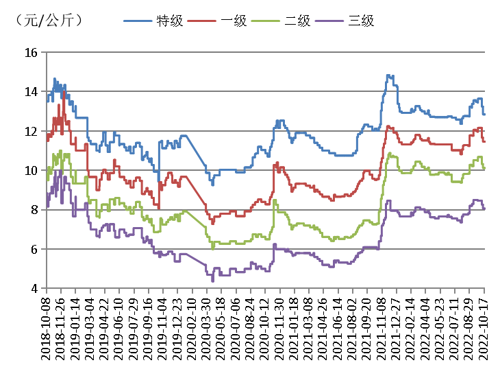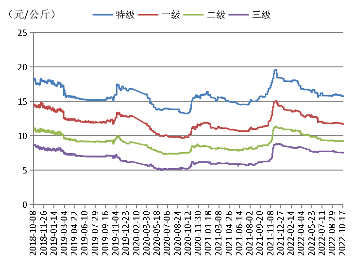 批发市场方面,截至10月20日,与上周同期相比,河北批发市场各等级骏枣、灰枣价格持平;河南批发市场各等级骏枣价格持平,各等级灰枣每公斤出货均价分别下跌0.33元至0.66元不等。调研显示,河北红枣批发市场恢复交易后,市场行情基本稳定,在新产季红枣未上市前,买卖行情暂无变化;河南部分红枣批发市场因防疫管控鲜有走货,企业多采取线上销售模式,价格有所下行。未来短期,批发市场红枣价格或将弱势运行。