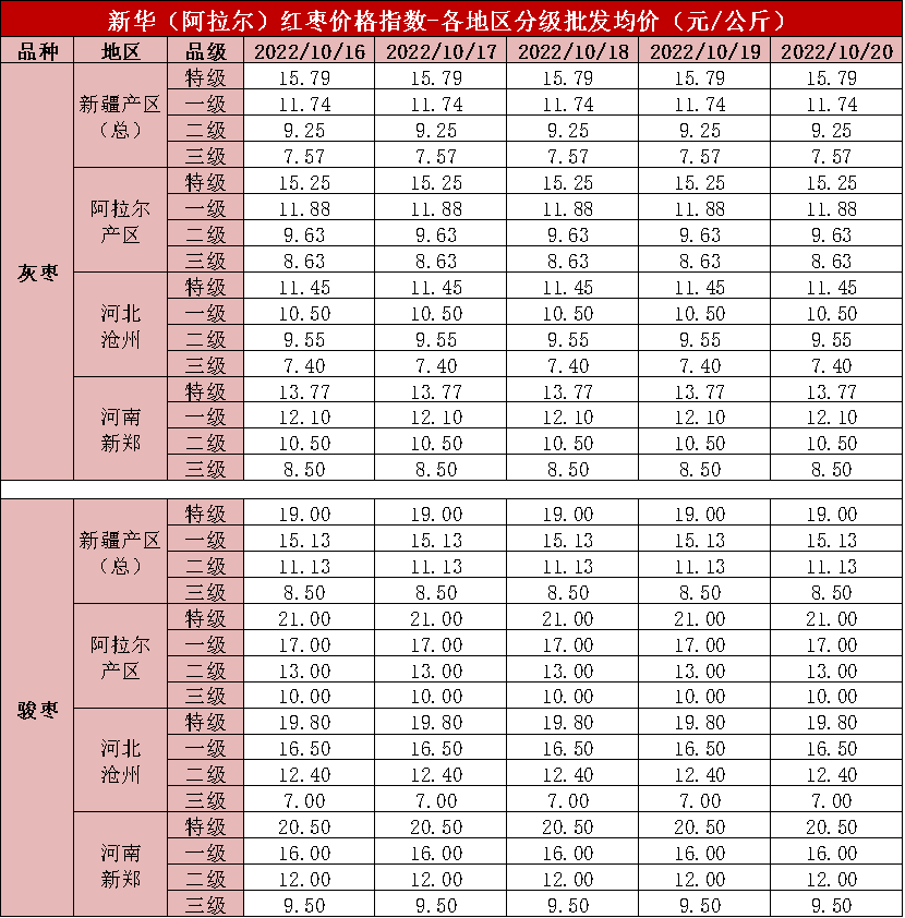 10月20日发布的新一期新华(阿拉尔)红枣价格指数显示,10月14日至10月20日当周,新疆产区红枣价格周环比持平,批发市场红枣价格周环比微幅下行。