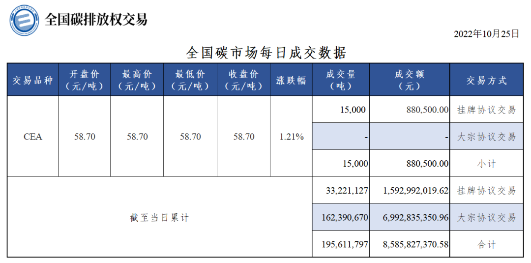 10月25日全国碳市场收盘价58.70元/吨 较前一日上涨1.21%