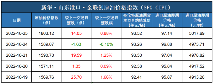 新华财经北京10月26日电(杨猛) 截至2022年10月25日,新华·山东港口·金联创原油价格指数(SPG CIPI)报1603.12点,较前一交易日上涨14.05点,涨幅0.88%;进口原油即期价格为97.14美元/桶,合人民币5017.69元/吨。山东港口进口原油综合到岸贴水估价为4.96美元/桶,较前一交易日下跌0.05美元/桶,跌幅1.00%。
