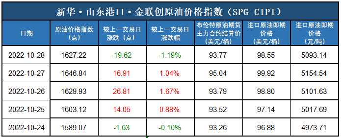 新华财经北京10月31日电(杨猛) 截至2022年10月28日,新华·山东港口·金联创原油价格指数(SPG CIPI)报1627.22点,较前一交易日下跌19.62点,跌幅1.19%;进口原油即期价格为98.55美元/桶,合人民币5093.14元/吨。山东港口进口原油综合到岸贴水估价为4.88美元/桶,较前一交易日下跌0.08美元/桶,跌幅1.61%。
