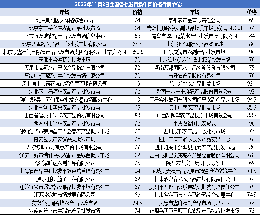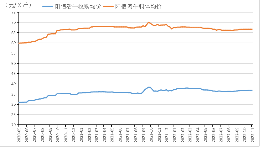 具体价格方面,截至2022年11月1日,阳信活牛收购均价报36.87元/公斤,环比上涨0.12元/公斤;阳信肉牛胴体均价报66.69元/公斤,环比持平。