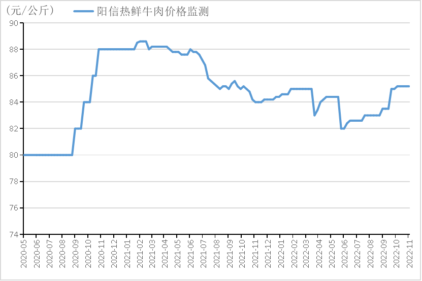 阳信热鲜牛肉价格监测数据显示,截至2022年11月1日,阳信热鲜牛肉价格报85.2元/公斤,环比持平。