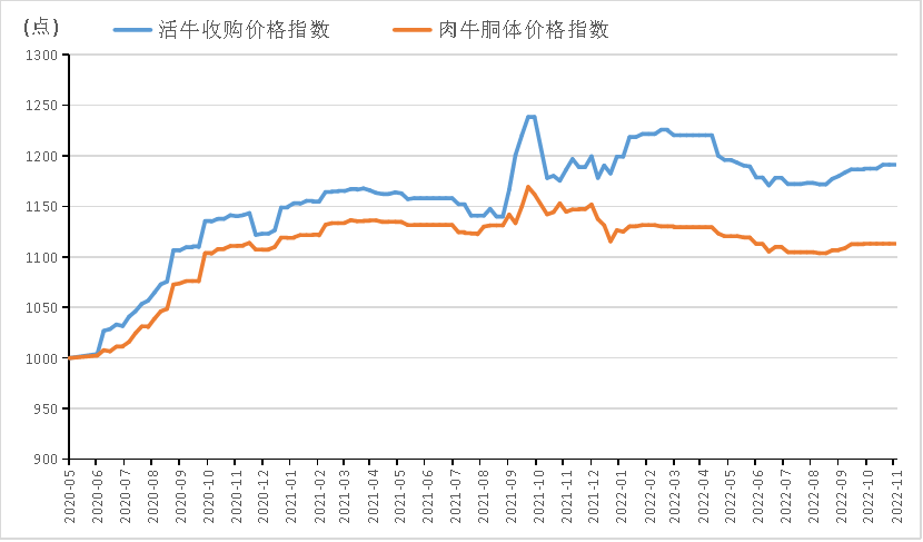 截至2022年11月1日,阳信活牛收购价格指数报1191.34点,环比(2022年10月3日,下同)上涨0.33%;阳信肉牛胴体价格指数报1113.15点,环比持平。