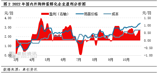 鸡苗盈利情况是影响孵化场采购种蛋积极性的主要指标。如图2所示,10月孵化企业均处于盈利状态,1-28日外购种蛋孵化企业平均盈利为0.58元/羽,明显高于今年孵化环节平均盈利(0.19元/羽)。孵化盈利丰厚,叠加苗价涨至年内高点,孵化企业对后市多持乐观心态,采购种蛋积极性明显提升,需求面成为支撑种蛋价格上行的主要动力。