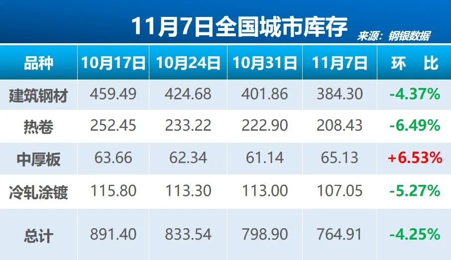 钢银电商7日公布的数据显示,截至11月7日的一周,全国39个城市,共计147个仓库的钢铁总库存量为764.91万吨,环比减少33.99万吨,降幅4.25%。