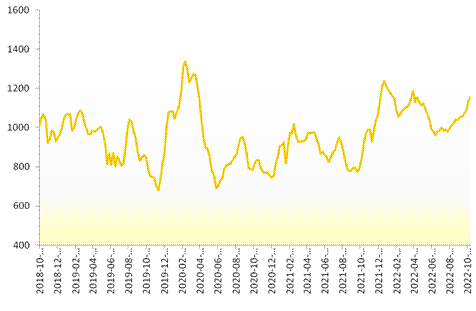 2022年11月2日,新华-进口香蕉价格指数报1158.42 点,较10月26日上涨22.75点,涨幅2.00%;较基期上涨158.42点,涨幅15.84%。