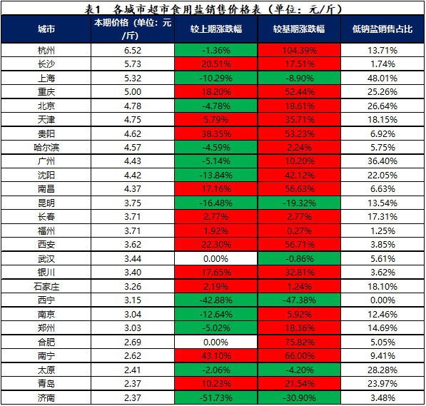 分价格区间来看,本期超市食用盐销售单价在5元/斤以上的城市有4个,分别是杭州、长沙、上海、重庆;超市食用盐销售单价在4-5元/斤之间的城市有7个,分别是北京、天津、贵阳、哈尔滨、广州、沈阳、南昌;超市食用盐销售单价在3-4元/斤之间的城市有10个,分别是昆明、福州、长春、西安、武汉、银川、石家庄、西宁、南京、郑州;超市食用盐销售单价在3元/斤以下的城市有5个,分别是合肥、南宁、太原、济南、青岛。