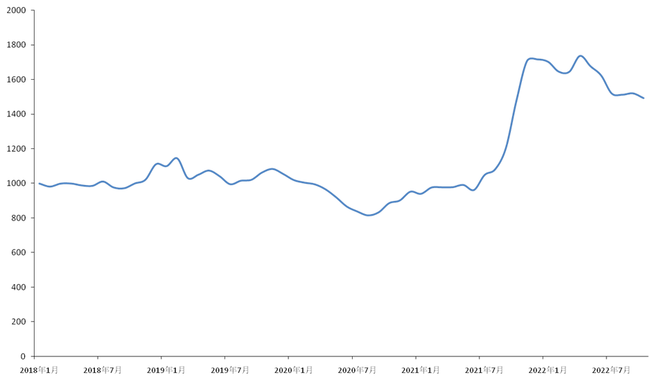 2022年10月,新华·中盐两碱工业盐价格指数报1492.90点,较上期(2022年9月)下跌27.53点,跌幅1.81%;较基期(2018年1月)上涨492.90点,涨幅49.29%。