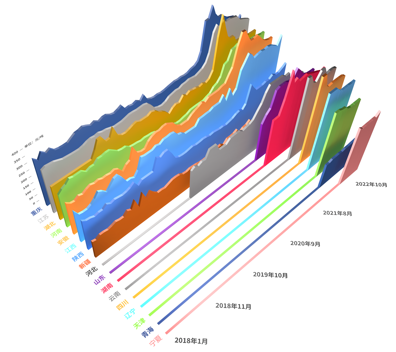 分区域来看,2022年10月,江西、湖南、重庆、河南、宁夏、天津、陕西、青海两碱工业盐出厂价格较2022年9月上涨;云南、四川、江苏、安徽、山东、河北、新疆两碱工业盐出厂价格较2022年9月下跌;辽宁、湖北两碱工业盐出厂价格较2022年9月持平。