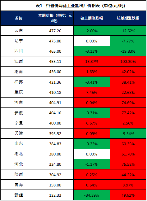 分价格区间来看,本期两碱工业盐单价在400-500元/吨之间的地区有10个,分别是云南、辽宁、四川、江西、湖南、江苏、重庆、河南、安徽、宁夏;两碱工业盐单价在400元/吨以下的地区有7个,分别是天津、山东、湖北、河北、陕西、青海、新疆。