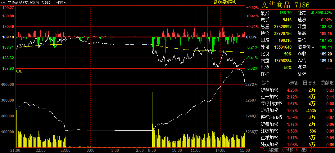 截至10日下午收盘时,追踪国内商品市场的综合指数收报188.30点,较前一交易日下跌0.80点,跌幅0.42%。全天商品市场累计净流入资金2.56亿元。