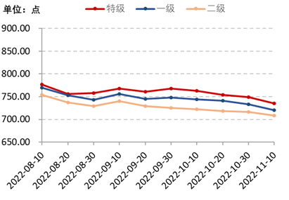 从质量等级维度来看,11月上旬各等级花椒价格再现微幅回调,各等级花椒价格差距缩小。截至11月10日,特级花椒价格指数报734.79点,较上期下跌1.85%,较基期下跌26.52%;一级花椒价格指数报720.73点,较上期下跌1.69%,较基期下跌27.93%;二级花椒价格指数报708.95点,较上期下跌1.10%,较基期下跌29.10%。