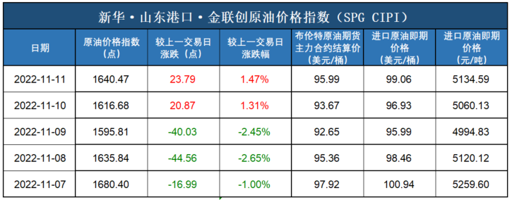 新华财经北京11月14日电(杨猛) 截至2022年11月11日,新华·山东港口·金联创原油价格指数(SPG CIPI)报1640.47点,较前一交易日上涨23.79点,涨幅1.47%;进口原油即期价格为99.06美元/桶,合人民币5134.59元/吨。山东港口进口原油综合到岸贴水估价为4.58美元/桶,较前一交易日上涨0.08美元/桶,涨幅1.78%。