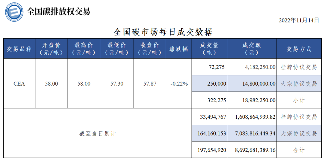 11月14日全国碳市场收盘价57.87元/吨 较前一日下跌0.22%