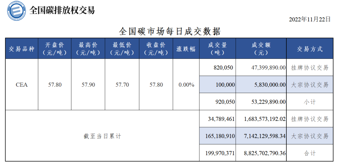 新华财经北京11月22日电 据微信公众号“全国碳交易”,11月22日全国碳市场碳排放配额(CEA)挂牌协议交易成交量820,050吨,成交额47,399,890.00元,开盘价57.80元/吨,最高价57.90元/吨,最低价57.70元/吨,收盘价57.80元/吨,收盘价与前一日持平。今日大宗协议交易成交量100,000吨,成交额5,830,000.00元。今日全国碳排放配额(CEA)总成交量920,050吨,总成交额53,229,890.00元。