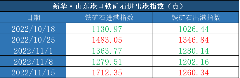 截至2022年11月15日,新华·山东港口铁矿石进港指数报1712.35点,较11月8日上涨432.84点,涨幅33.83%;新华·山东港口铁矿石出港指数报1260.34点,较11月8日上涨58.18点,涨幅4.84%。