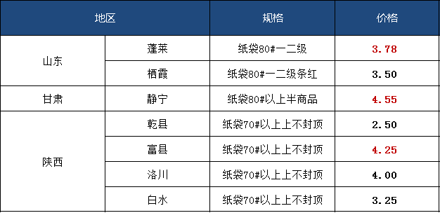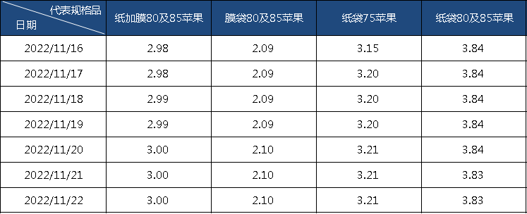 指数监测显示,截至11月22日,纸加膜80及85规格富士苹果均价为3.00元/斤,膜袋80及85规格富士苹果均价为2.10元/斤,纸袋75规格富士苹果均价为3.21元/斤,纸袋80及85规格富士苹果均价为3.83元/斤。