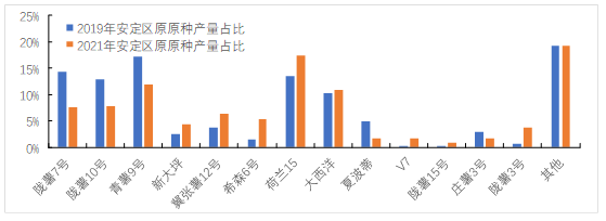 具体来看,陇薯7号的原原种生产规模领跌,较2019年占比下跌6.89个百分点。品牌化的新大坪,还有品相相近的早大白原原种生产均有提升。原原种生产规模提升最为显著的是希森6号,较2019年占比上涨3.75个百分点。