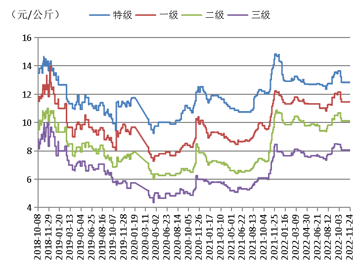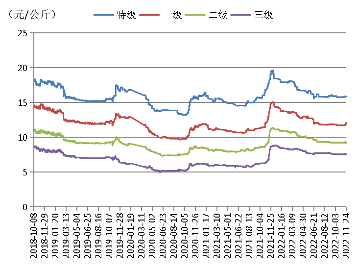 新疆产区方面,截至11月24日,与上周同期相比,各等级骏枣与特级灰枣价格持平,一级灰枣每公斤出货均价上涨0.28元,二级、三级灰枣每公斤出货均价分别下跌0.14元和0.10元。调研显示,产区部分企业开始陆续收购新产季红枣,但收购量有限,少数企业根据当前生产成本对不同级别红枣价格进行调整,流通仍存在一定困难,交易量不大。未来短期,新疆产区红枣价格或将稳中有升。