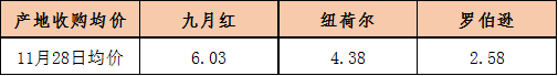 在脐橙产地收购方面,秭归九月红、纽荷尔、罗伯逊等脐橙品种逐渐进入市场。截至11月28日,秭归九月红产地收购均价报6.03元/公斤,同比上涨39.59%;纽荷尔产地收购均价报4.38元/公斤,同比上涨40.37%;罗伯逊产地收购均价报2.58元/公斤,同比上涨28.85%。