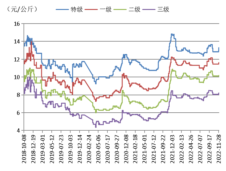 批发市场方面,截至12月1日,与上周同期相比,河北、河南红枣批发市场各等级骏枣价格持平;河北批发市场特级、一级、三级灰枣每公斤出货均价分别上涨0.40元、0.15元和0.35元,河南批发市场特级、一级、二级灰枣每公斤出货均价分别上涨0.50元、0.17元和0.10元。调研显示,红枣批发市场新产季红枣陆续到货,产品质量获得批发企业认可,但市场防疫管控持续,交易量不大。未来短期,批发市场红枣价格或将基本持平。