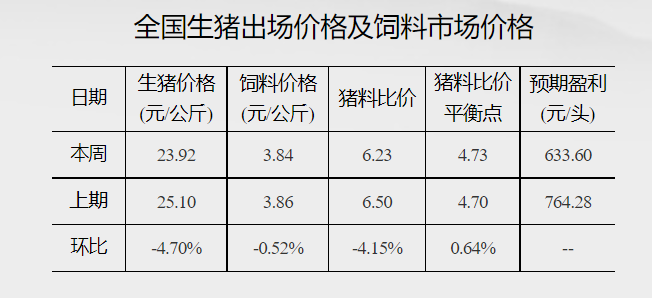 新华财经北京12月5日电 据国家发展改革委价格监测中心,截至11月30日当周全国猪料比价为6.23,环比跌幅4.15%。按目前价格及成本推算,未来生猪养殖头均盈利为633.60元。当周南北生猪市场价格走势分化,周均价环比下滑。周内北方需求依旧偏弱,对猪价利好支撑不足,屠宰企业压价阻力较小,猪价震荡走低;而南方腌腊活动相继开启,对肥猪需求量增加,同时屠宰企业开工率提升,带动猪价持续上涨。随着终端消费有所好转,预计本周猪价或小幅上涨。
