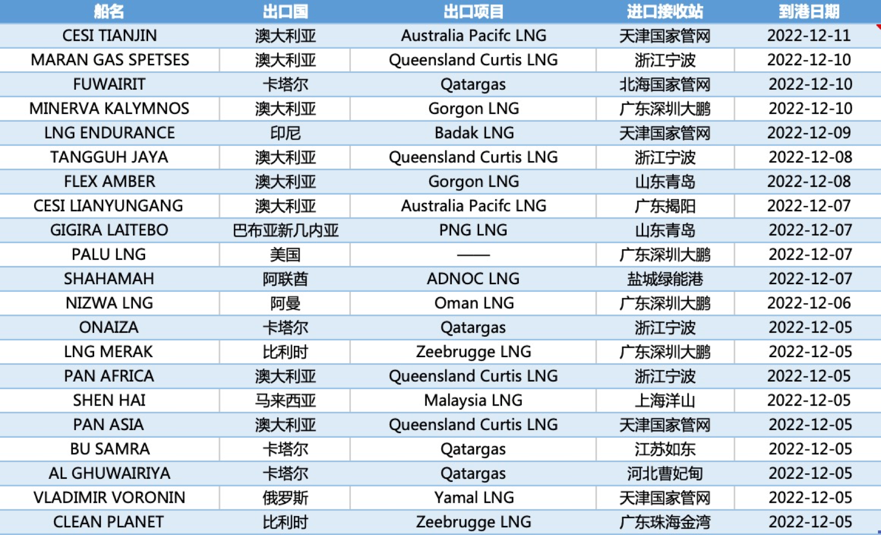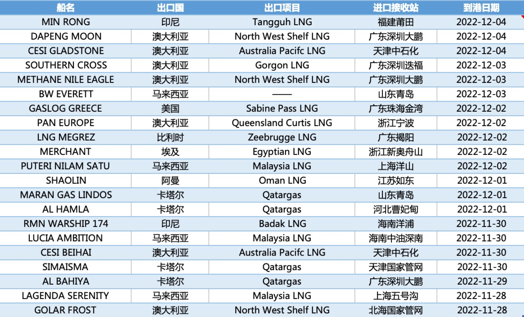 从到货地看,11月28日-12月4日当周,华南地区(含福建)共接卸10船LNG,长三角地区接卸5船,环渤海地区接卸6船。其中,深圳大鹏LNG接收站接卸3船,共计约22万吨,数量最多。