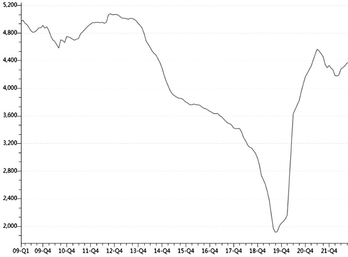 图为近年来我国能繁母猪存栏量(单位:万头)