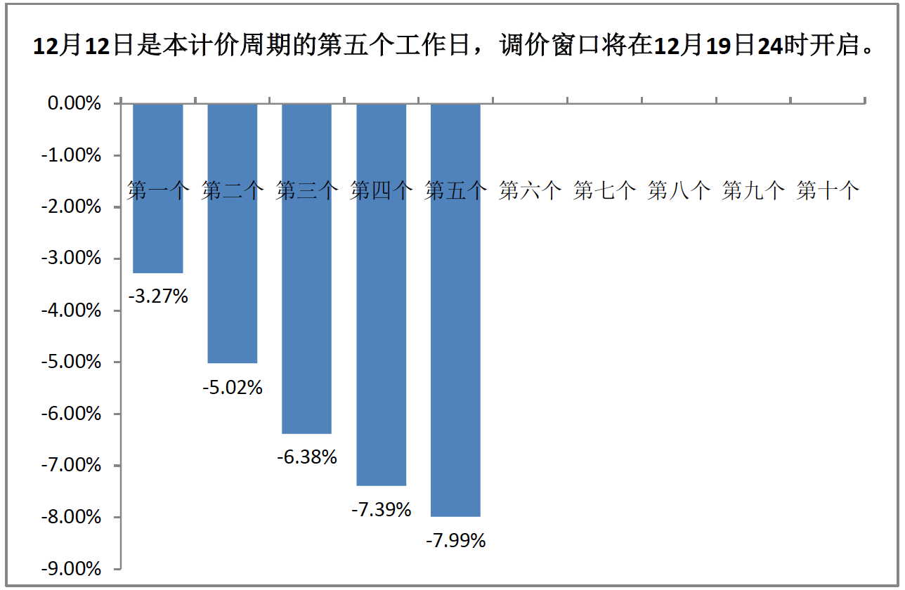成品油:中国汽、柴油批发价格显示,12月9日中国汽、柴油批发价格下跌。全国92#汽油平均批发价格为8167元/吨,较前一日下跌29元/吨;柴油(含低凝点)平均批发价格为8310元/吨,较前一日下跌54元/吨。当日市场整体情况来看,8日国际油价下跌,一揽子原油平均价格变化率负向幅度加深,消息面利空发展对油市施压明显,汽、柴油价格延续跌势,且实际成交维持宽松优惠。