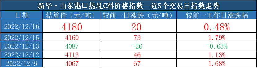 截至2022年12月16日,新华·山东港口热轧C料价格指数报4180元/吨,较前一交易日上涨20元/吨,涨幅0.48%。