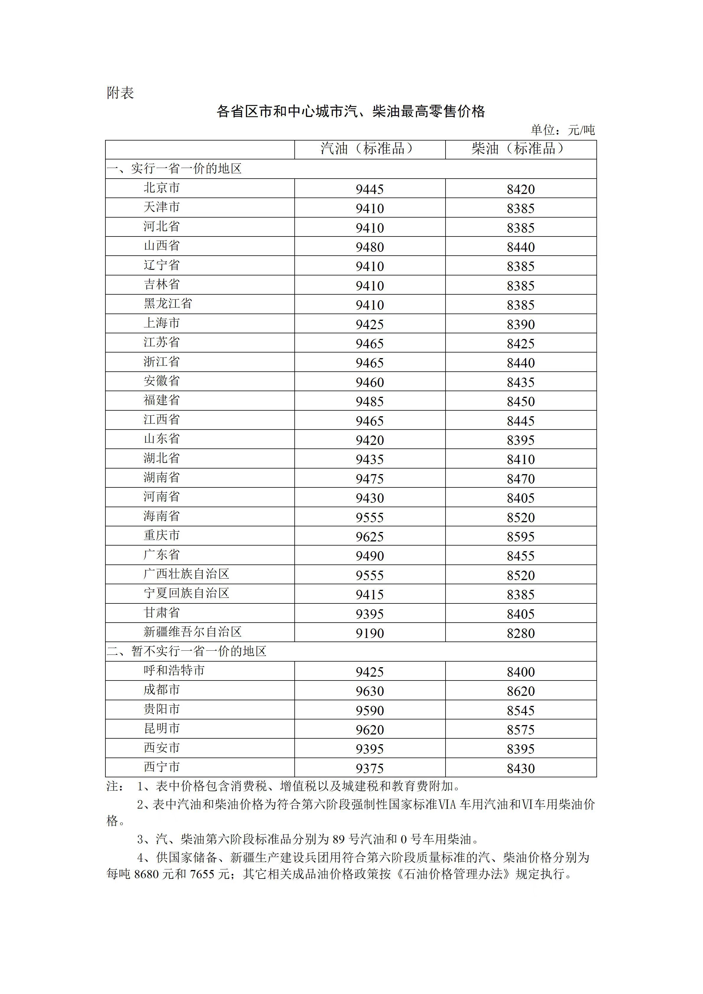 新华财经北京12月19日电 根据近期国际市场油价变化情况,按照现行成品油价格形成机制,自2022年12月19日24时起,国内汽、柴油价格(标准品,下同)每吨分别降低480元和460元。调整后,各省(区、市)和中心城市汽、柴油最高零售价格见附表。相关价格联动及补贴政策按现行规定执行。